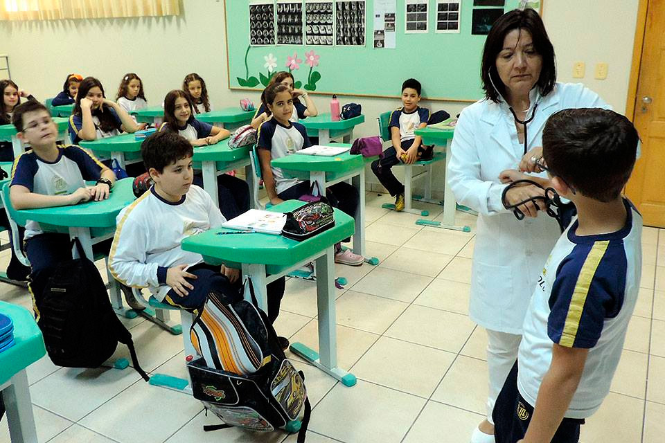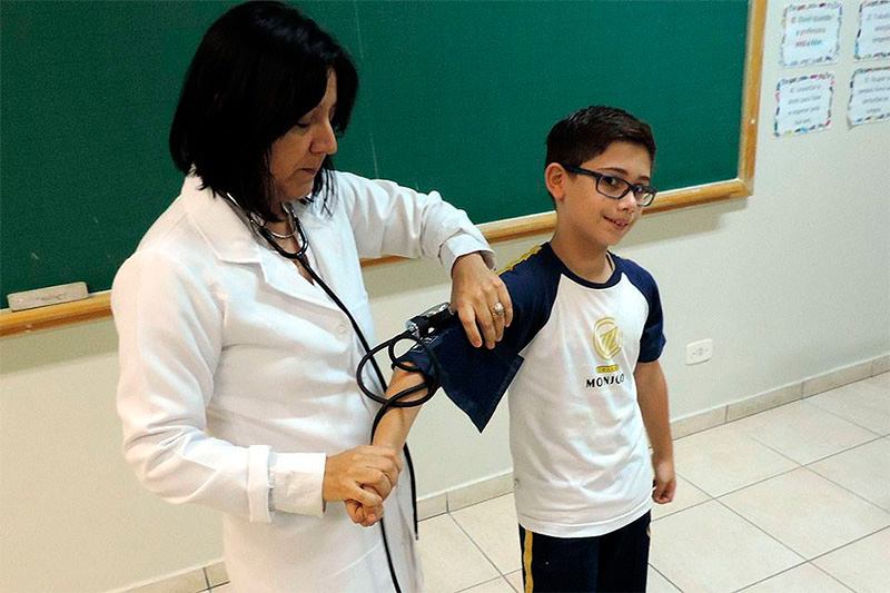 Durante esta aula aprenderam um pouco mais sobre as funções e o manuseio de alguns instrumentos médicos: o termômetro, o esfigmomanômetro e o estetoscópio.