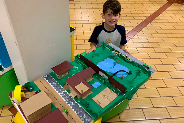 Na disciplina de Geografia, foi trabalhado o conteúdo: "Pontos de referência e localização". Para colocar em prática o que foi estudado, os alunos dos 2° anos, juntamente com a família, confeccionaram uma maquete do quarteirão do seu bairro